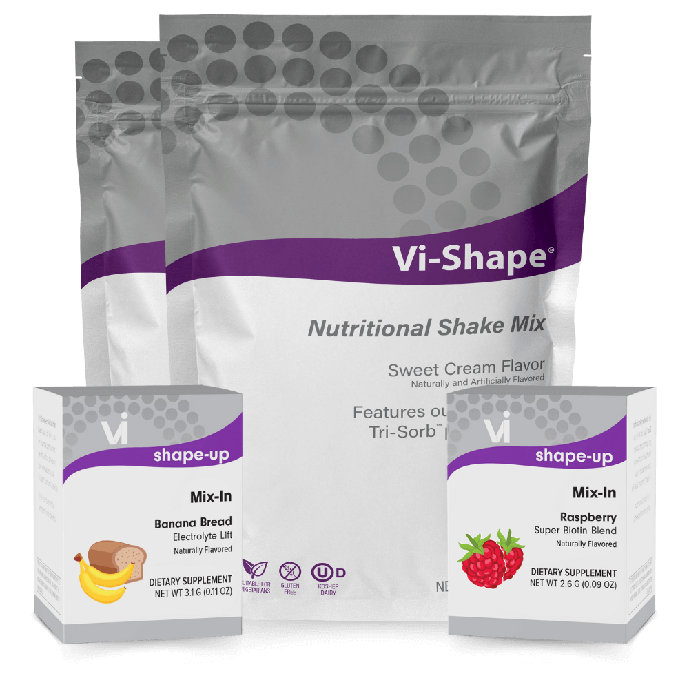 2 Shake Pouches (48 Servings) + 1 Box Banana Bread Electrolyte Lift Mix-In + 1 Box Raspberry Super Biotin Blend Mix-In